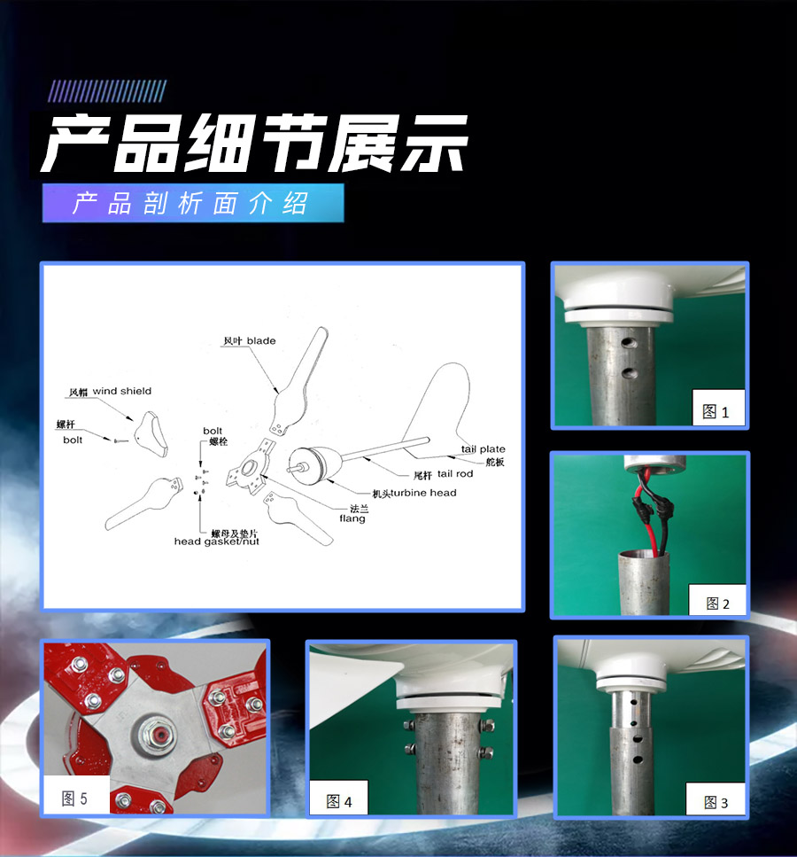 6、獨特的尾舵預偏設計,自動精確對準迎風方向,提高輸出功率同時兼顧調整和強風保護。